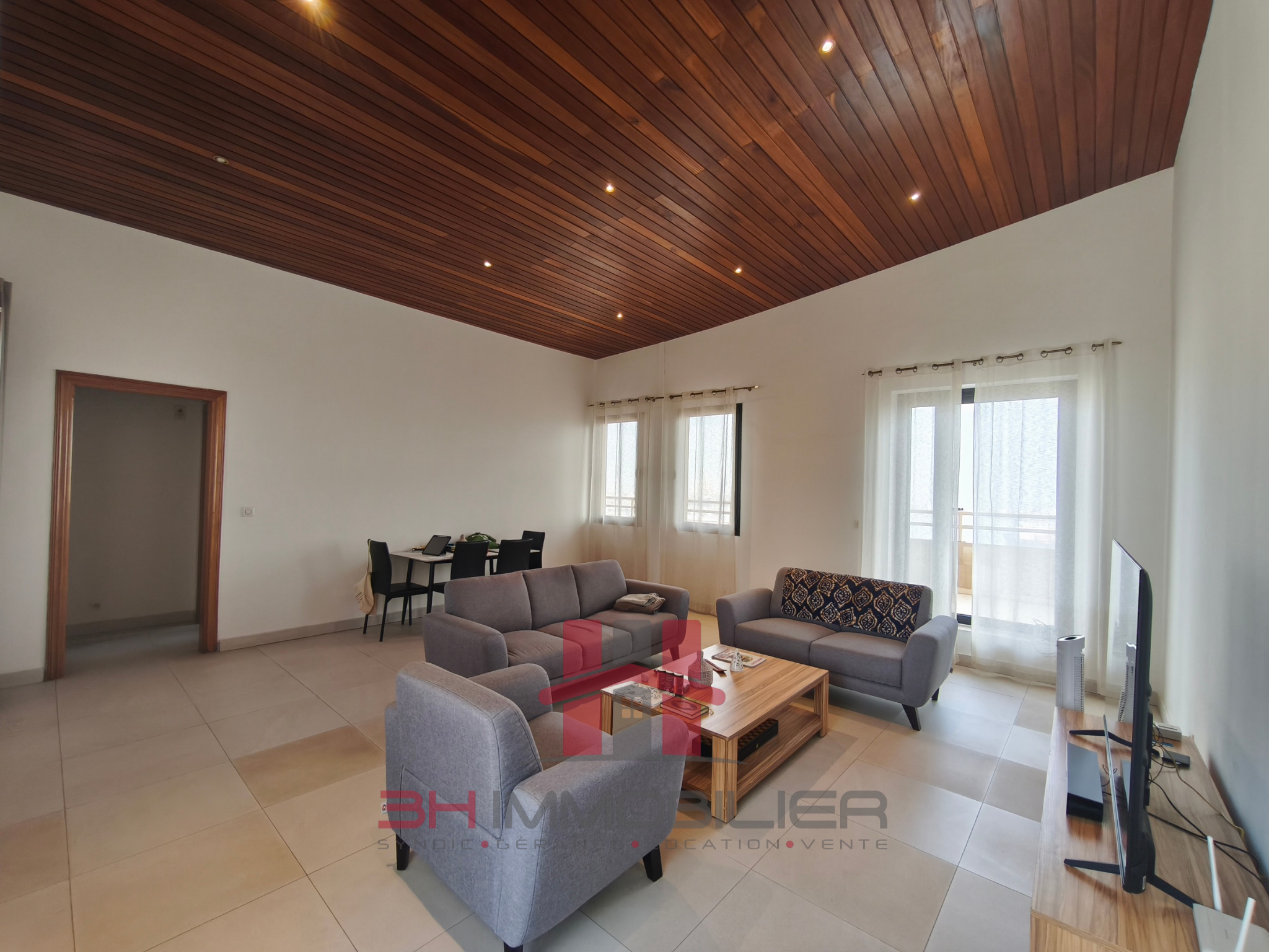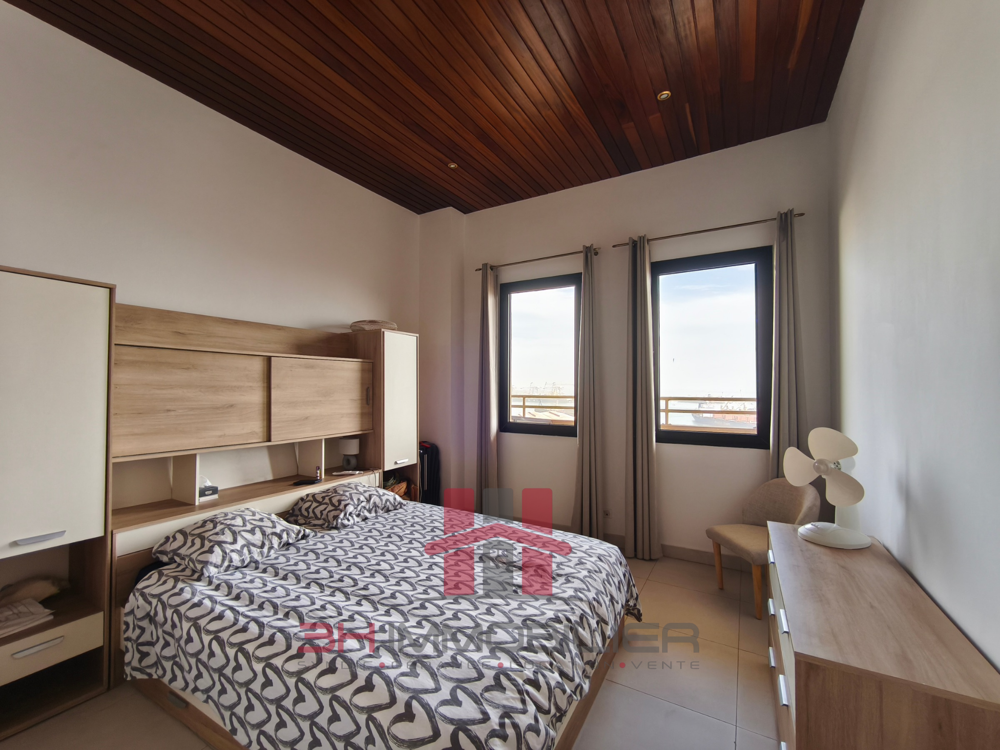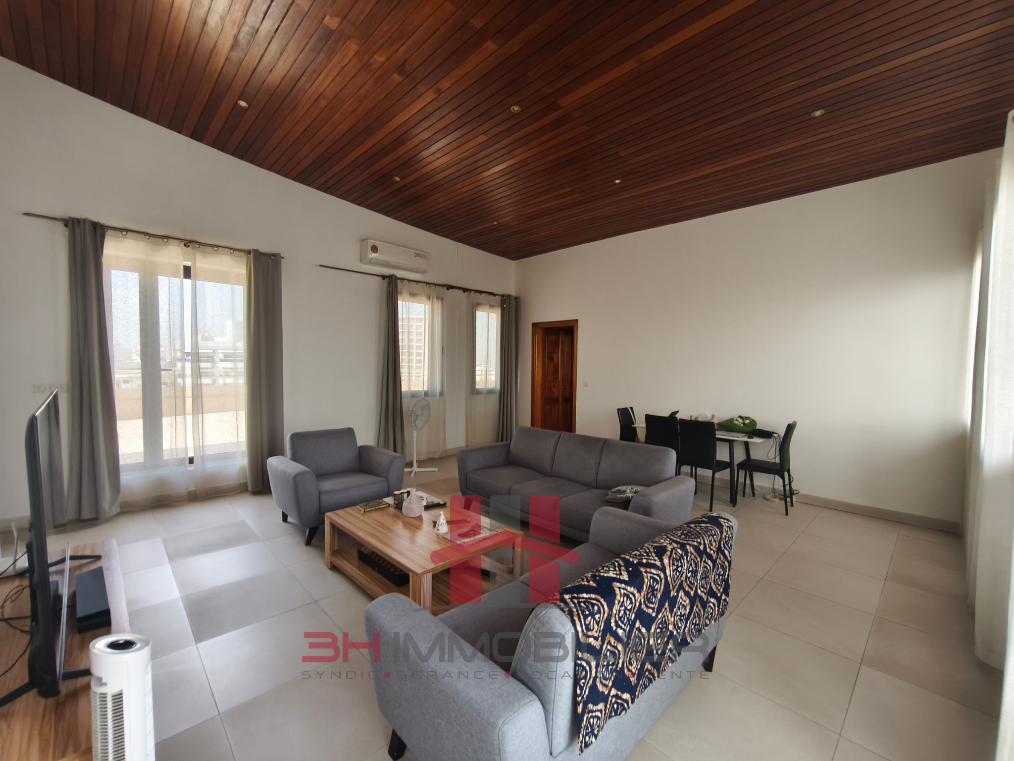Situé au dernier étage d’un immeuble situé en centre ville de Dakar, non loin de la gare. Un appartement composé de :